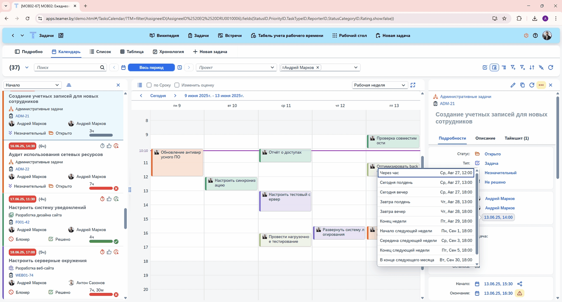 Возможность не только указать срок выполнения задачи, но и спланировать, в какое время сотрудник будет заниматься задачей. Расставляйте задачи в порядке выполнения, основываясь на их зависимости друг от друга, командной работы, вашего рабочего времени.