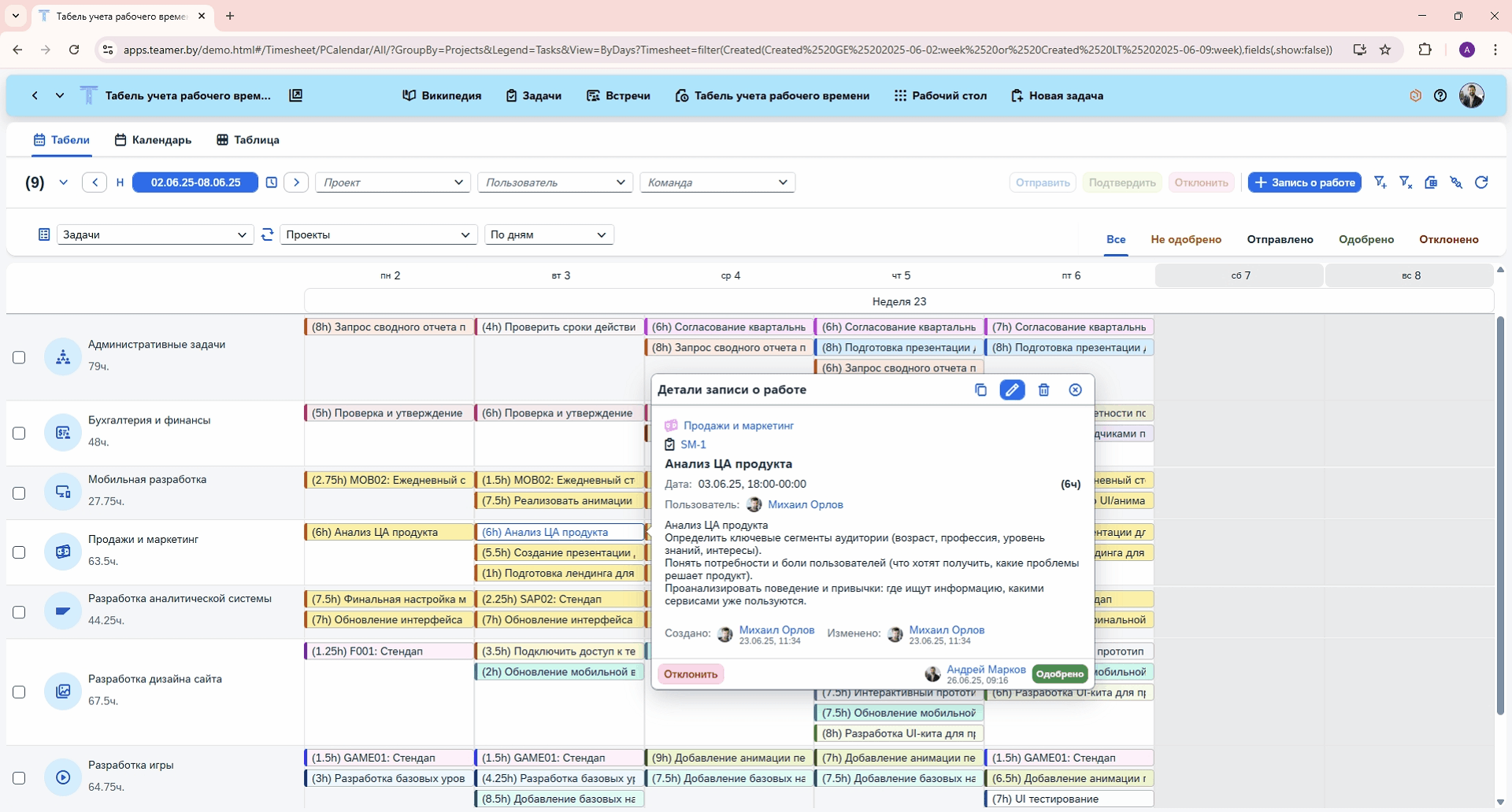 Контролирование, корректировка и согласование рабочего времени своих команд. Руководители видят как календарь каждого сотрудника по отдельности, так и всей команды.