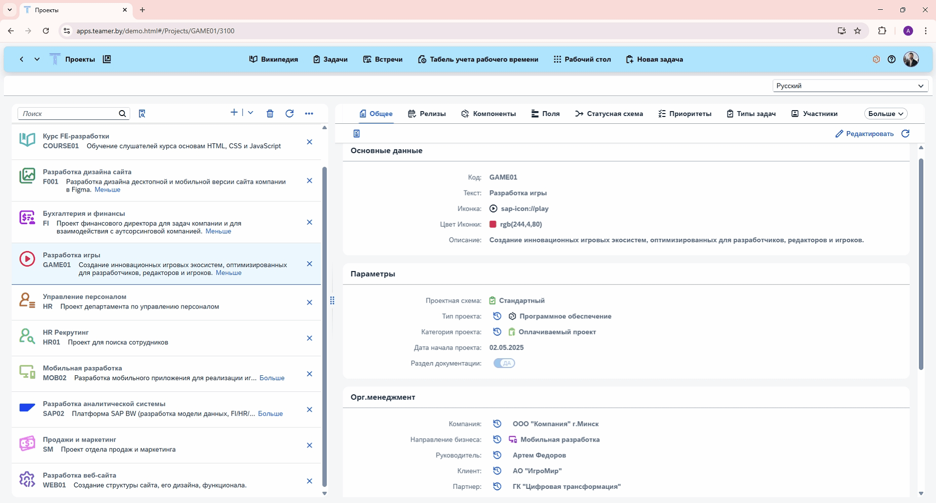 - указывайте дату начала и окончания проекта, управляйте статусами проекта, закрывайте успешные проекты.