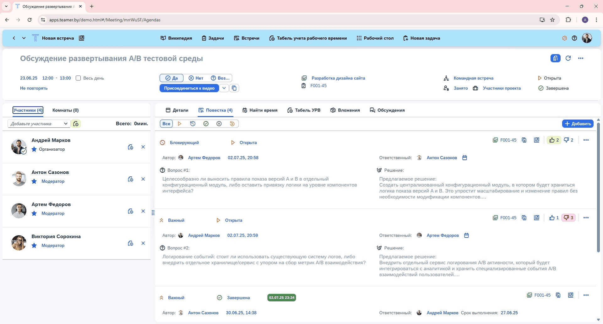 Используйте приложение для полного погружения в работу. Назначайте задачи на участников команды, следите за сроками, проводите встречи и обсуждения, вносите правки и добавляйте новый функционал.