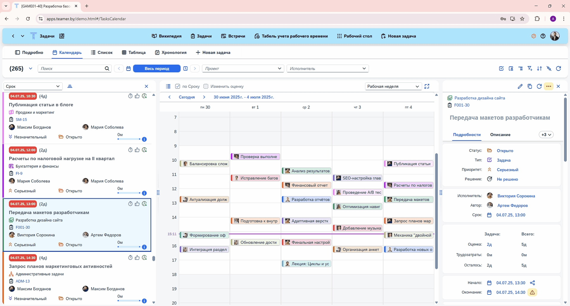 Благодаря интеграции таск-менеджера с календарем, вы можете удобно планировать задачи и назначать встречи. Учитывайте планируемую работу ваших коллег и проставляйте связанные задачи для оптимизации работы над продуктом.
